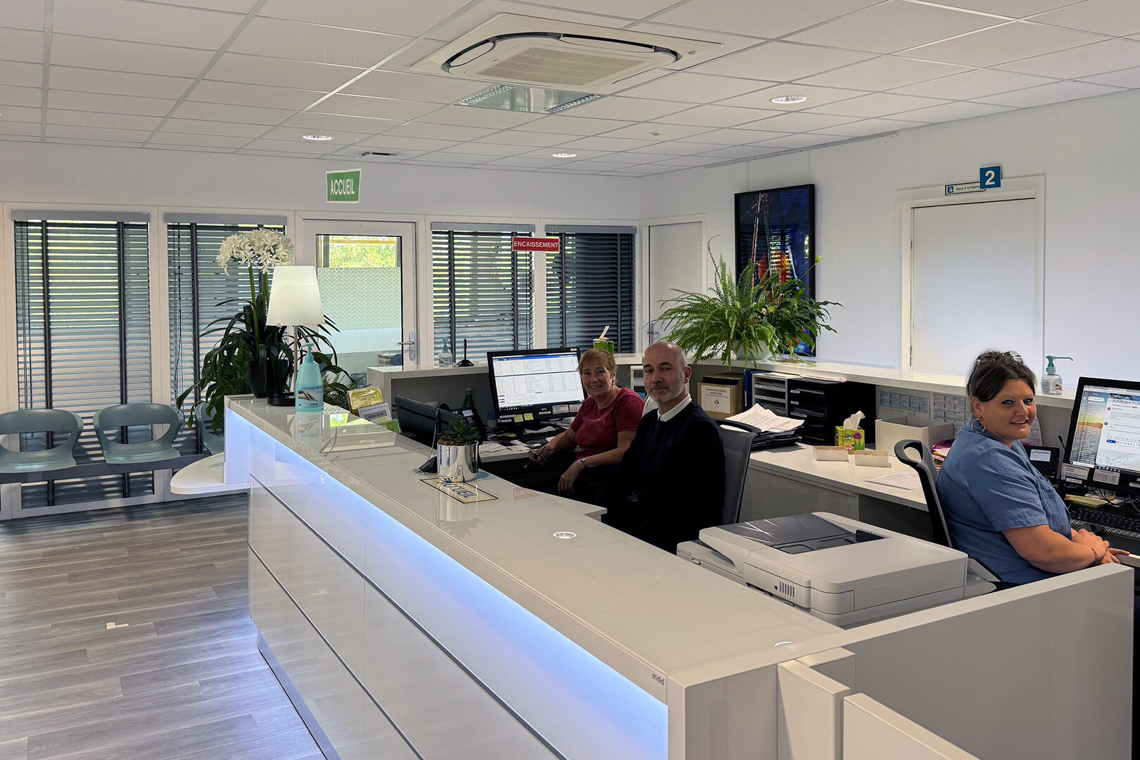 Dès que vous franchissez les portes du cabinet, vous êtes reçu(e) dans un espace clair et apaisant. Le poste d’accueil, animé par une équipe souriante et bienveillante, est là pour répondre à vos questions et vous orienter avec attention.